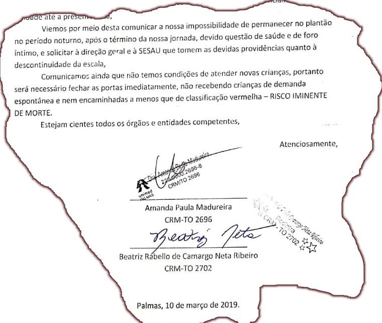 Coincidentemente ao caso de Gurupi, neste domingo, 10, as médicas Amanda Paulo Madureira e Beatriz Rabelo de Camargo Neta Ribeiro, que atendem no Hospital Público Infantil de Palmas, registraram um Boletim de Ocorrência na Central de Atendimento da Polícia Civil de Palmas comunicando que as escalas de plantões encontravam-se “desfalcadas” e que estaria gerando uma série de problemas no atendimento médico e devido o médico pediatra que atenderia na subsequência aos seus plantões marcado para iniciar às 19h30min. teria comunicado que não iria e “em decorrência disso, não terá para quem repassar o plantão”, deixando assim os pacientes desassistidos. Além do B.O., as duas médicas notificaram o caso ao CRM, SESAU, Núcleo Interno de Regulação, Samu, UPAS, Conselho Estadual de Saúde, Sindicatos dos Médicos, Ministério Público e Defensoria Pública Estadual.