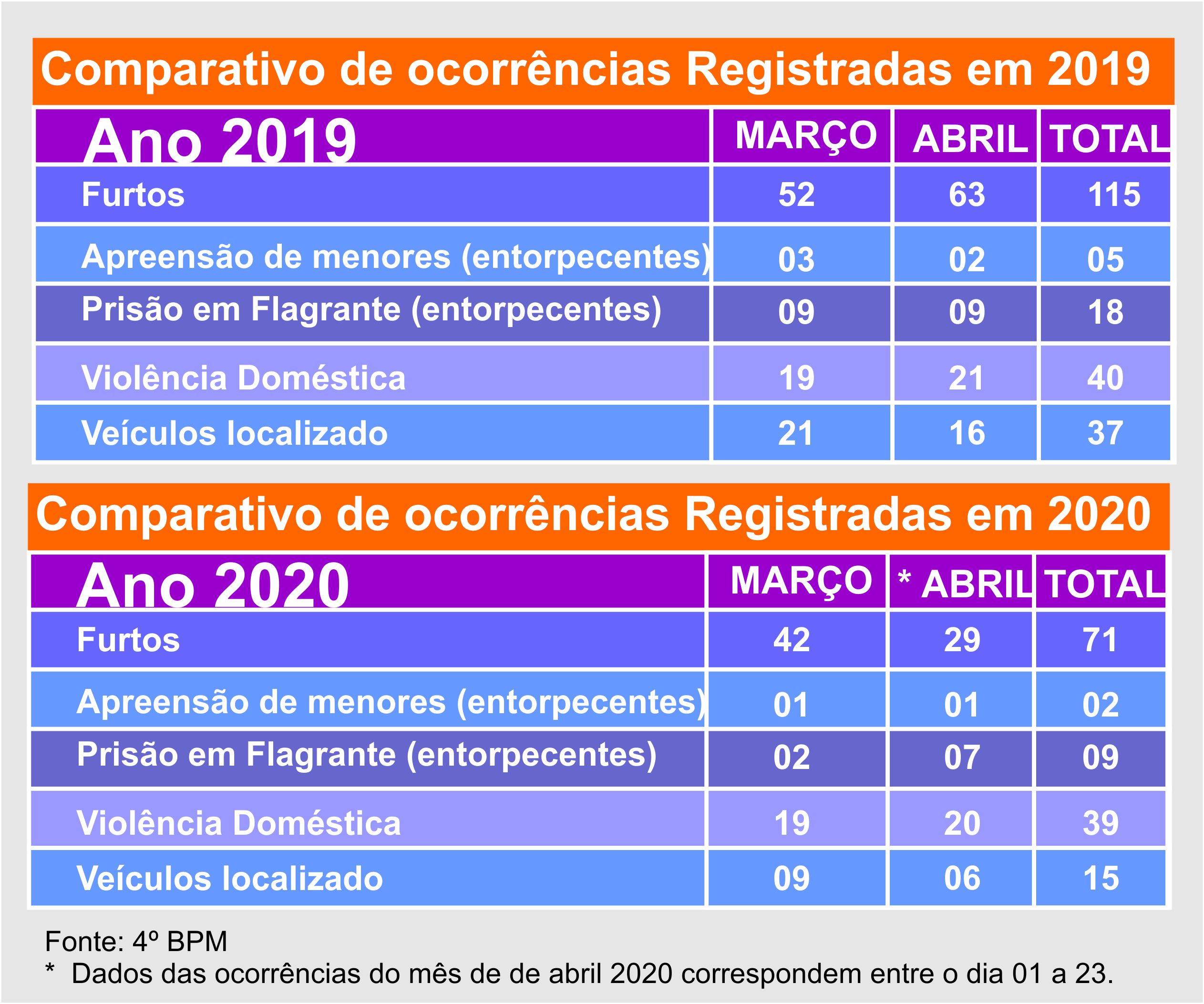 O comandante 4º Batalhão de Polícia Militar (4º BPM), tenente-coronel Jaime Porfírio de Souza, informou que no mês de março de 2019 aconteceram em Gurupi 52 furtos e 63 em abril, totalizando 115 e no comparativo com 2020 reduziu para 42 em março 29 em abril. “Fazendo uma análise de ocorrências registradas em Gurupi nos anos de 2019 e 2020, nota-se que houveram reduções nos números de furtos, apreensão de menores, prisão em flagrante, violência doméstica e veículos localizados”, disse o comandante.