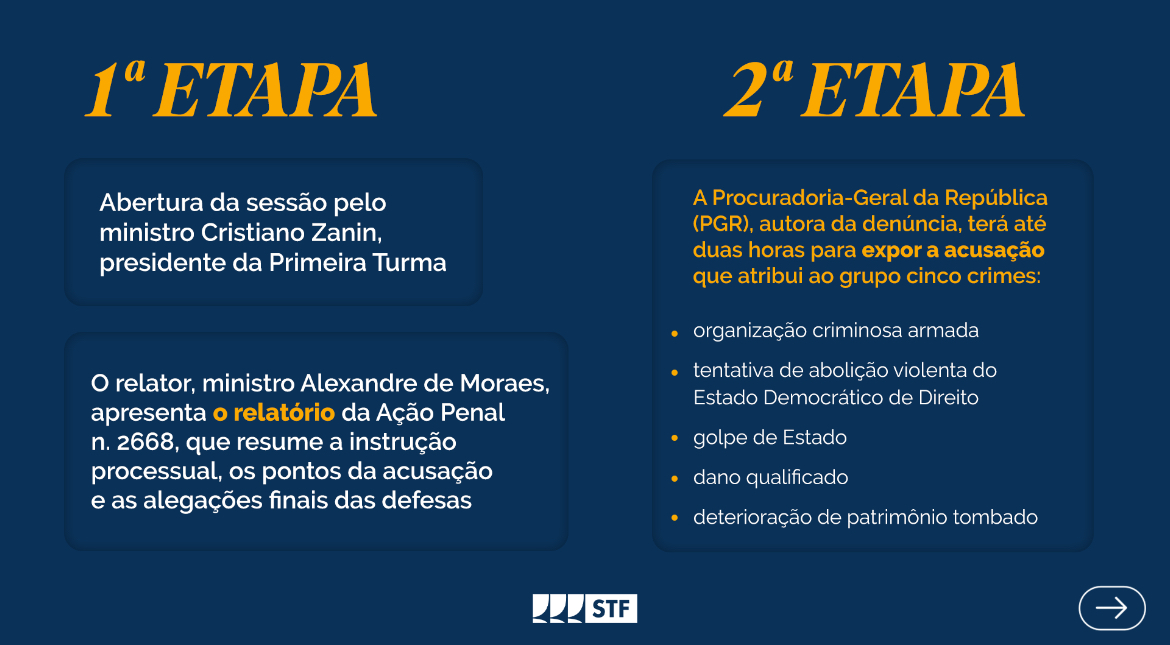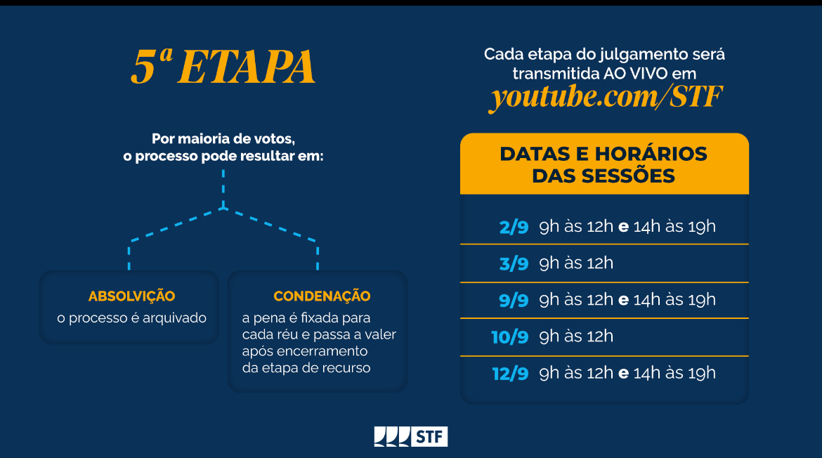 Confira as etapas do julgamento seguem as normas da Lei 8.038/1990, do Regimento Interno do @STF e do Código de Processo Penal (Decreto-Lei 3.689/1941):