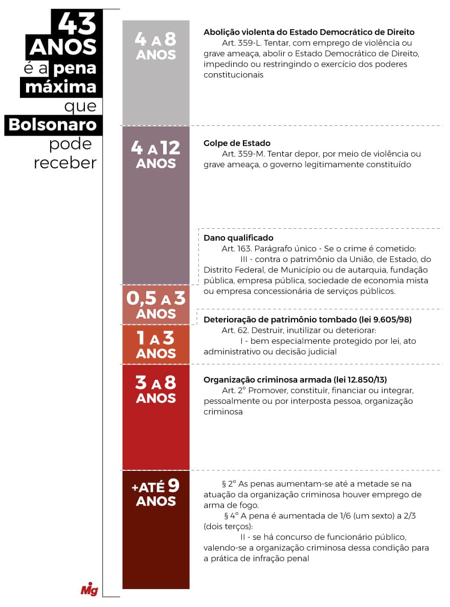 A pena mínima seria de 12 anos de prisão. No entanto, agravantes, como o papel de liderança atribuído a Bolsonaro e o envolvimento de servidores públicos, podem elevar substancialmente a condenação.