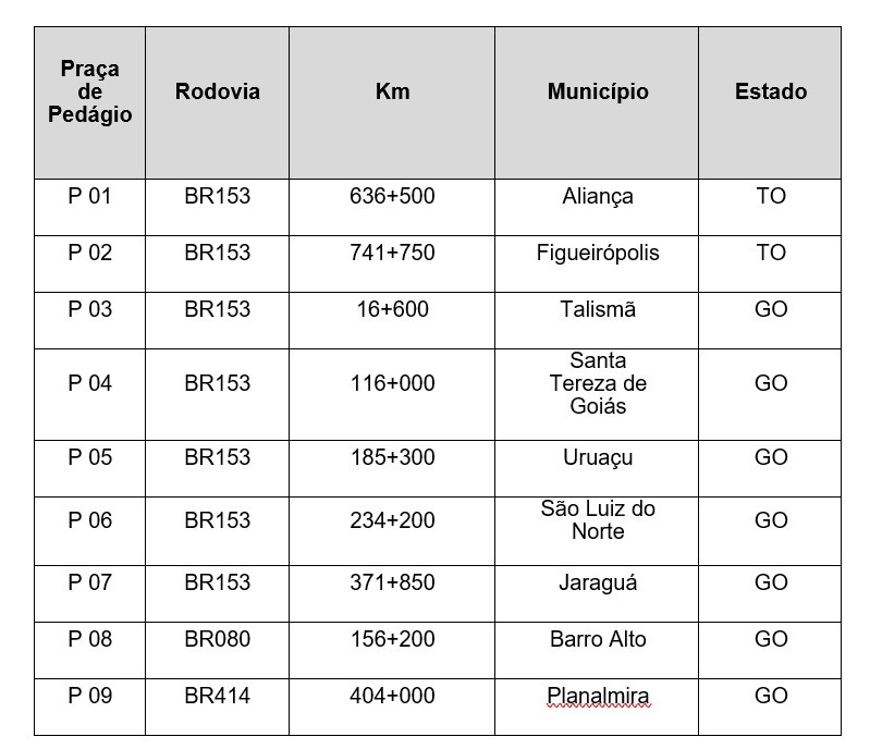 PRAÇAS DE PEDÁGIO – O projeto prevê 9 praças de pedágio, que geram empregos nas cidades ao redor: Aliança/TO, Figueirópolis/TO, Talismã/GO, Santa Tereza de Goiás/GO, Uruaçu/GO, São Luiz do Norte/GO, Jaraguá/GO, Barro Alto/GO e Planalmira/GO.