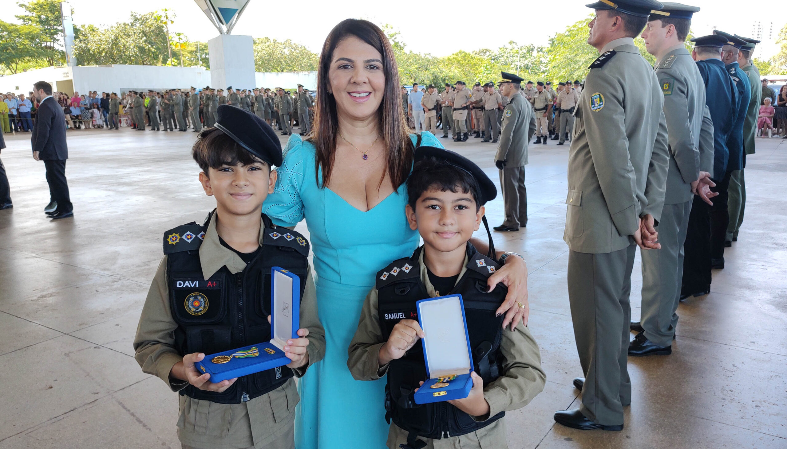 Representando o seu marido, coronel Francinaldo Machado Bó, da PMTO; e o seu irmão, tenente-coronel Gleidistone Gomes Cavalcanti da Silva, comandante do Regimento de Polícia Montada (RPMONT) da cavalaria do Estado da Paraíba, a servidora civil da PMTO, enfermeira Gleidistania Gomes Cavalcanti Bó, acompanhada de seus dois filhos, Davi, de 11 anos, e Samuel, de 9, recebeu a Medalha Tiradentes em nome dos dois.