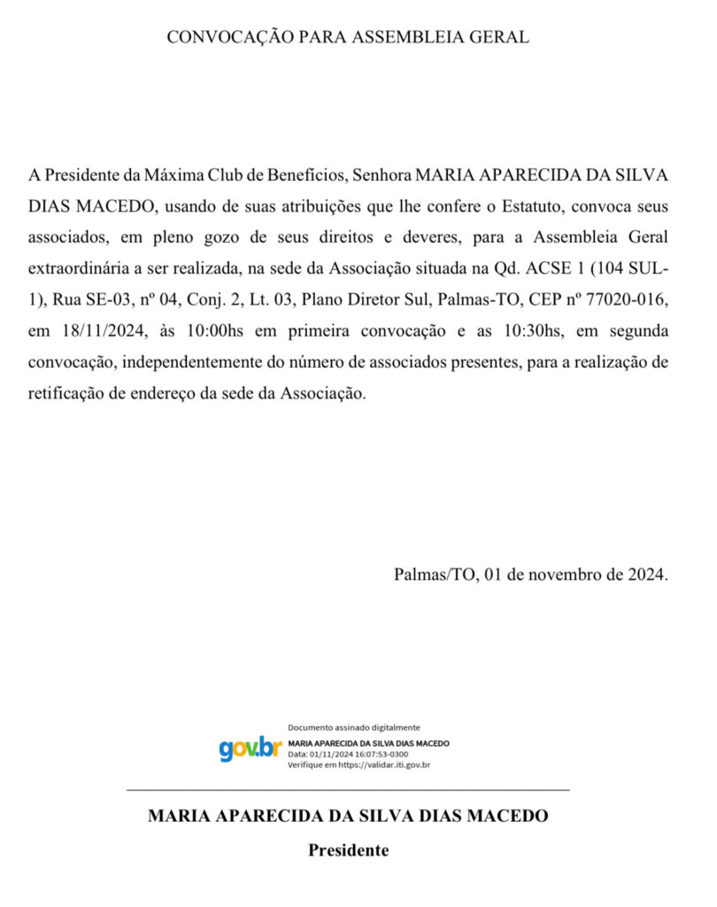 A Presidente da Máxima Club de Benefícios, Senhora MARIA APARECIDA DA SILVA DIAS MACEDO, usando de suas atribuições que lhe confere o Estatuto, convoca seus associados, em pleno gozo de seus direitos e deveres, para a Assembleia Geral