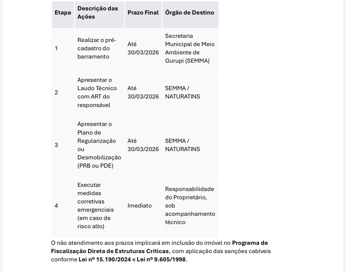 Os prazos e procedimentos detalhados para a regularização dos barramentos estão descritos integralmente na Nota de Chamamento publicada no Diário Oficial do Município de Gurupi.