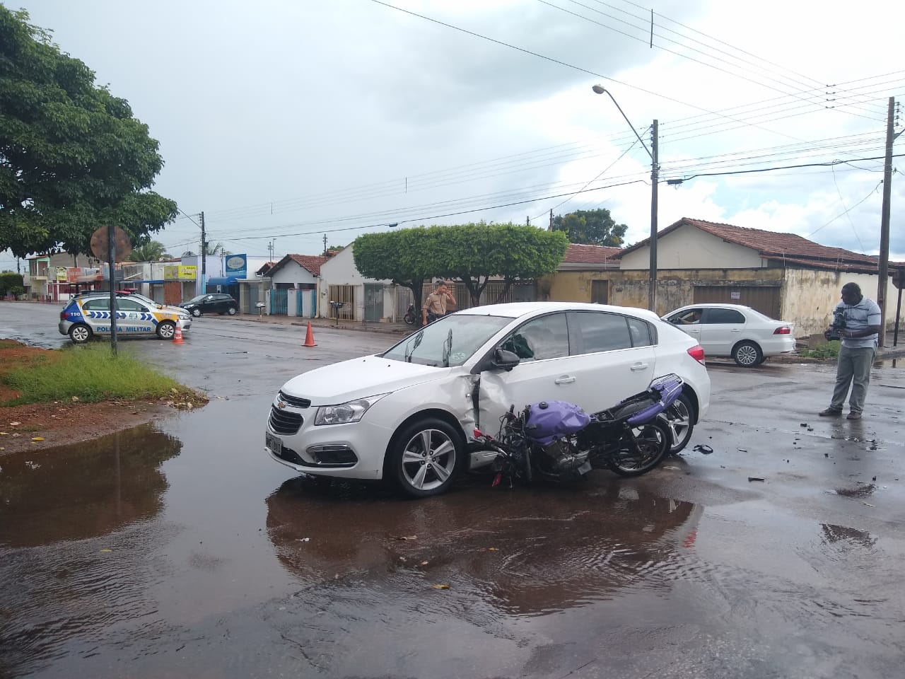Na tarde desta quarta-feira (08) foi registrado um acidente de trânsito envolvendo um carro e uma motocicleta. Segundo testemunhas, chovia muito no momento da colisão entre os veículos.