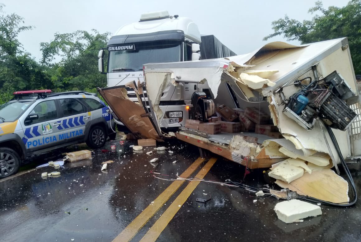 Segundo a Polícia Rodoviária Federal, o condutor do caminhão que estava carregado com laticínios perdeu o controle da direção do veículo e colidiu com um caminhão-tanque abastecido com amônia que trafegava no sentido contrário.