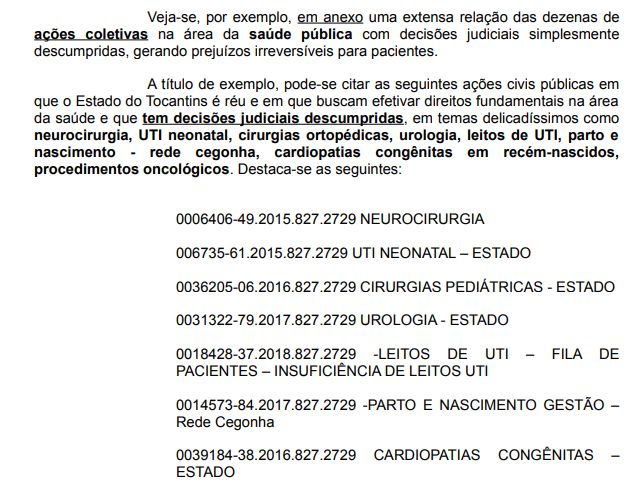 Segundo ele, a título de exemplo, as decisões da área da saúde descumpridas dizem respeito à neurologia, UTI Neonatal, cirurgias ortopédicas, urologia, leitos de UTI, parto e nascimento – rede cegonha, cardiopatias congênitas em recém-nascidos e procedimentos oncológicos.