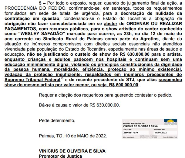 Confira a íntegra da ação visando suspender show do cantor Wesley Safadão na Agrotins