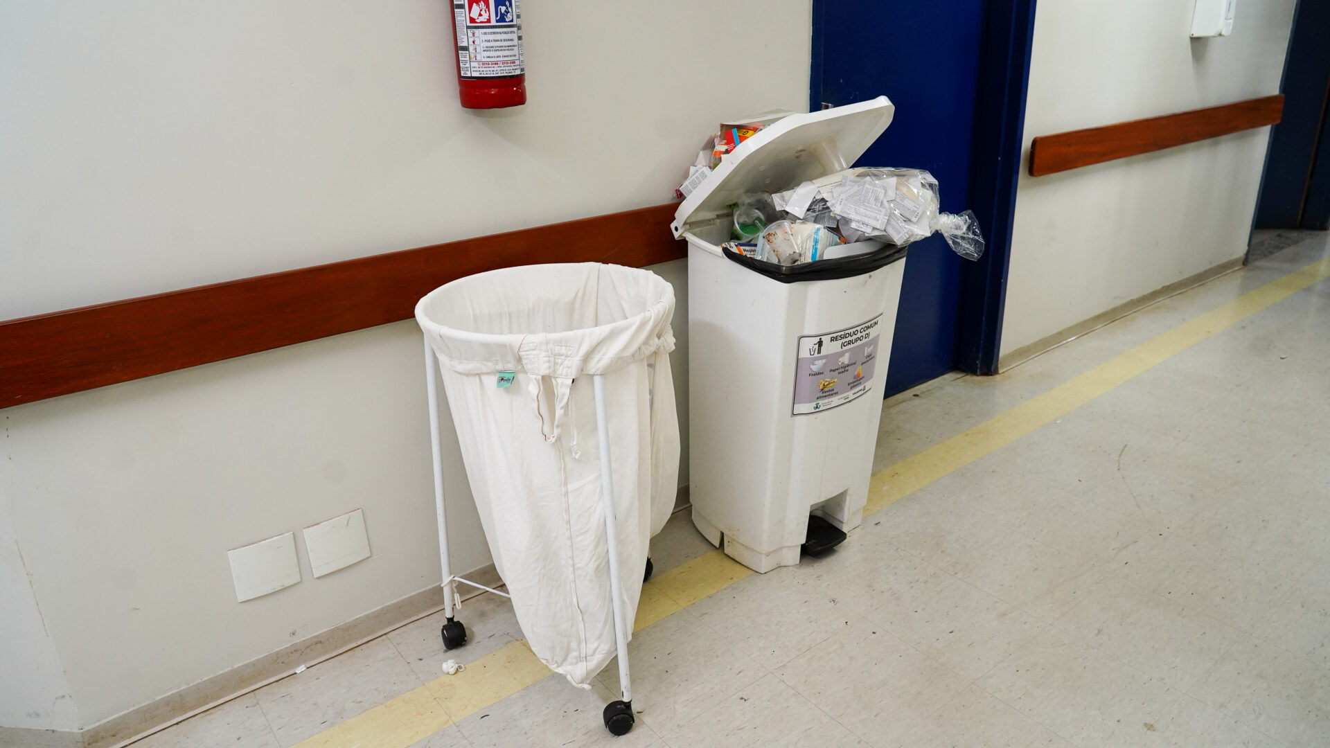 Em relação à limpeza, verificou-se piso sujo, lixeira das enfermarias transbordando (inclusive com restos de alimentos) e que o depósito de material de limpeza da ortopedia estava vazio, sem que tivessem sido atendidos os pedidos por botas de borracha, desinfetante hospitalar e detergente. Somente um profissional de limpeza estava atuando no setor no momento da vistoria.