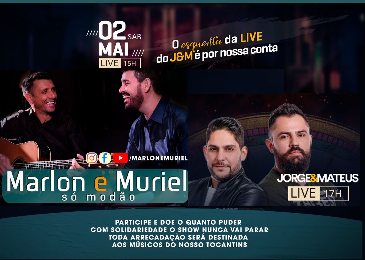 A live de Marlon e Muriel começa às 15h no YouTube que você pode acessar e se inscrever pelo link: https://www.youtube.com/channel/UCorjdZLUIDhX-l7CFdhgL9w e ainda servirá de esquenta para a da dupla Jorge e Mateus, que vai ao ar às 17. As doações serão feitas através de uma conta oficial e tudo o que for arrecadado vai para a classe musical.