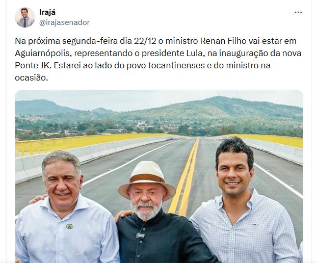 O ministro dos Transportes, Renan Filho, deverá estar em Aguiarnópolis na próxima segunda-feira, 22 de dezembro, para participar da inauguração da nova Ponte JK, que liga o Tocantins ao Maranhão. A agenda foi confirmada pelo senador Irajá, que informou que o ministro representará o presidente Luiz Inácio Lula da Silva no ato oficial. De acordo com as informações mais recentes, o presidente não deve comparecer pessoalmente à cerimônia de entrega da obra.