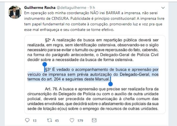 O delegado titular da Delegacia de Repressão a Crimes de Maior Potencial contra a Administração Publica (DRACMA), Guilherme Rocha, anunciou nesta terça (12) em sua conta no twitter, que não barrará a imprensa de acompanhar mandados de busca e apreensão durante operações.