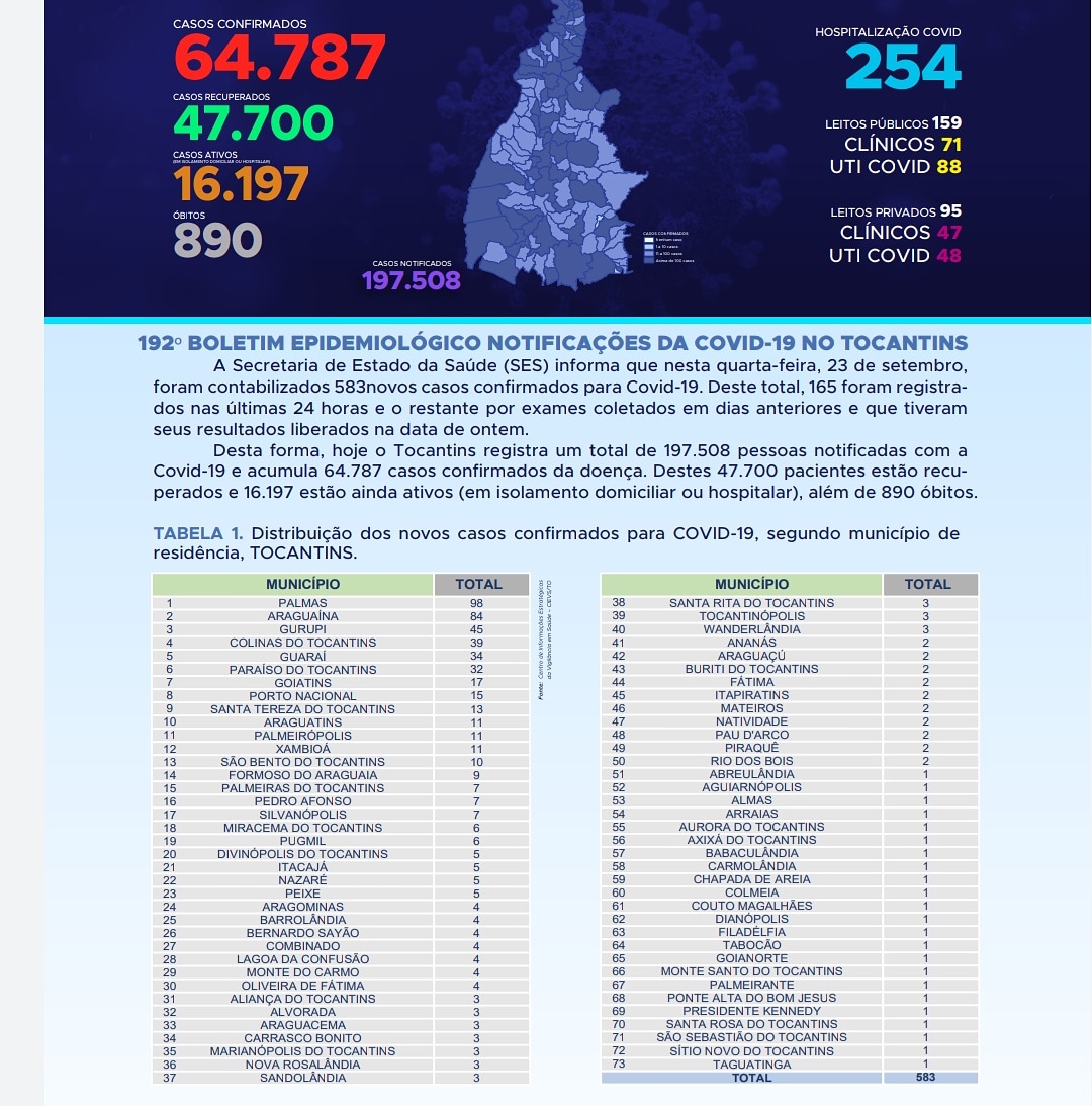 Atualmente, o Tocantins contabiliza 197.508 pessoas notificadas com a Covid-19 e acumula 64.787 casos confirmados. Destes, 47.700 pacientes estão recuperados, 16.197 pacientes seguem em isolamento domiciliar ou hospitalar e 890 pacientes foram a óbito.