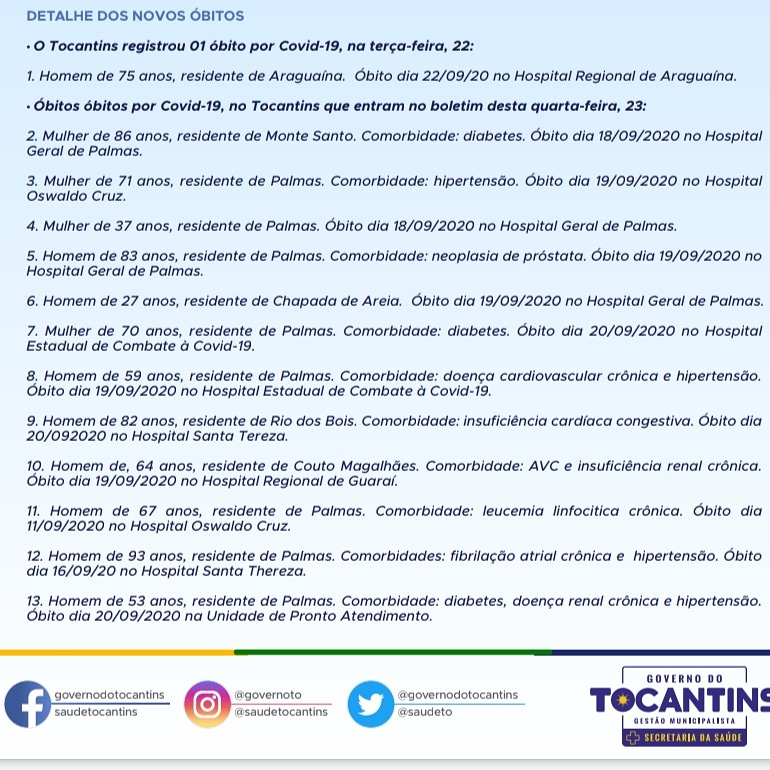 O Estado possui uma plataforma onde todos podem acompanhar os números da Covid-19 no Tocantins: http://integra.saude.to.gov.br/covid19