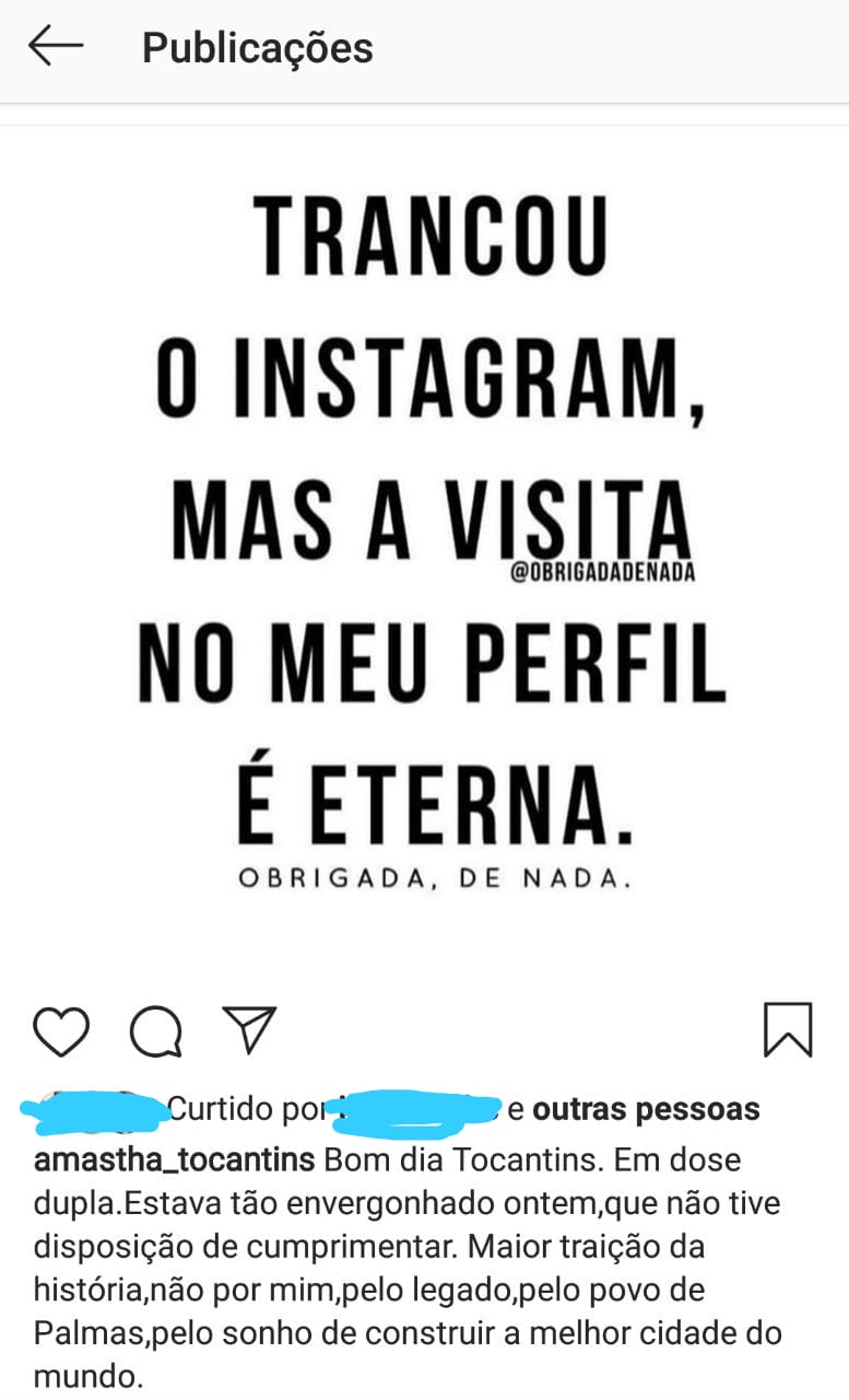 Em sua conta no instagram Amastha publicou: “Trancou o instagram, mas a visita no meu perfil é eterna”, a indireta deu para todo mundo notar que foi direcionada para a prefeita de Palmas Cinthia Ribeiro (PSDB) e que foi sua ex-vice prefeita.