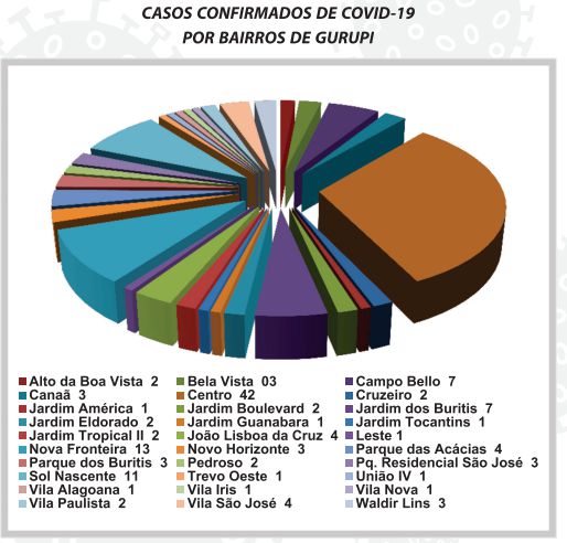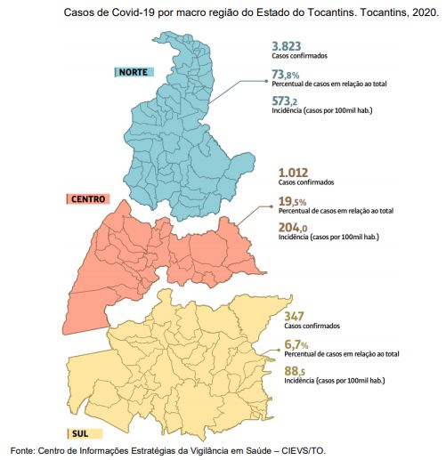 Gurupi está localizada na macro região Sul do Tocantins composta por 392mil habitantes, concentra-se o menor número de casos (6,7%), de óbitos (9%) e menor incidência por 100 mil hab. 88,5. Enquanto a macro região Norte que tem Araguaína como referência (667mil habitantes) concentra o maior número de casos 73,8% do montante do Estado, 69% dos óbitos e a incidência por 100 mil hab. é de 573. Na macro região Central onde encontra-se Palmas, Paraíso do Tocantins e Porto Nacional possui 496mil habitantes e o percentual de casos em relação ao total do Estado chegou na segunda-feira, 08, a 19,5%, com incidência (casos por 100mil hab.) de 204, possuiu 22% de percentual de óbitos em relação ao total.