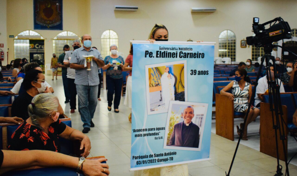 O Pe. Eldinei Carneiro presidiu na noite dessa última segunda-feira (03), na Paróquia Santo Antônio de Gurupi, no sul do estado, a missa pelos seus 39 anos de vida. A homilia foi feita pelo Vigário Geral, Pe. Valdemir Alves.