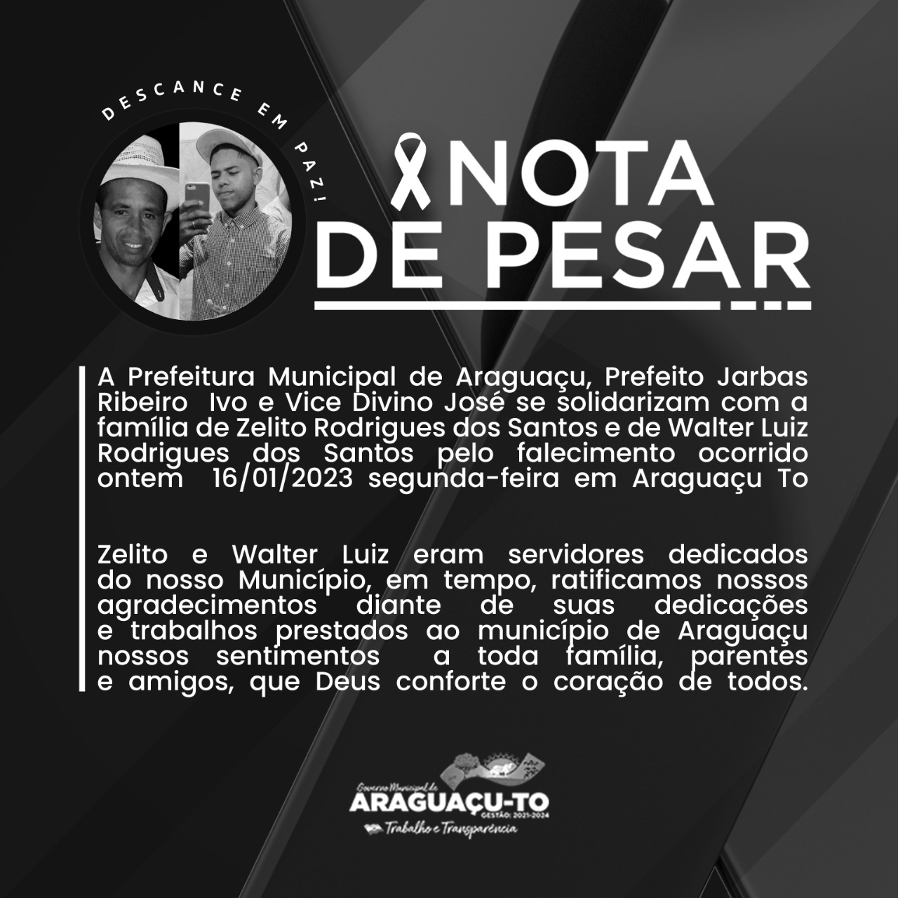 Por meio de nota, a prefeitura de Araguaçu lamentou a tragédia envolvendo os dois servidores. “Zelito e Walter Luiz foram dois grandes Heróis que dedicaram suas vidas a salvar um ao outro e hoje estão nos braços do nosso Pai eterno. Eles eram queridos pelo nosso Prefeito Jarbas Ribeiro e Vice Divino José pelo carinho e dedicação que tinham em trabalhar pelo nosso município, sempre trabalhando com muito prazer e Alegria”, destaca a nota.
