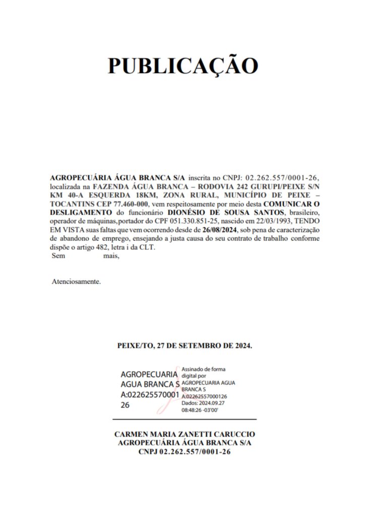 TOCANTINS CEP 77.460-000, vem respeitosamente por meio desta COMUNICAR O DESLIGAMENTO do funcionário DIONÉSIO DE SOUSA SANTOS, brasileiro, operador de máquinas, portador do CPF 051.330.851-25, nascido em 22/03/1993, TENDO EM VISTA suas faltas que vem ocorrendo desde de 26/08/2024, sob pena de caracterização de abandono de emprego, ensejando a justa causa do seu contrato de trabalho conforme dispõe o artigo 482, letra i da CLT.