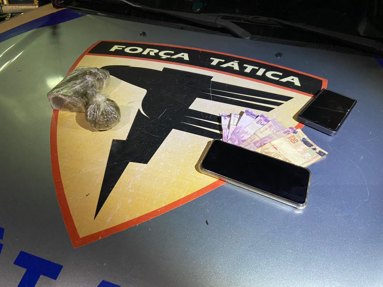 Foi localizado e apreendido com os suspeitos duas porções de substância análoga à maconha totalizando 341 gramas.