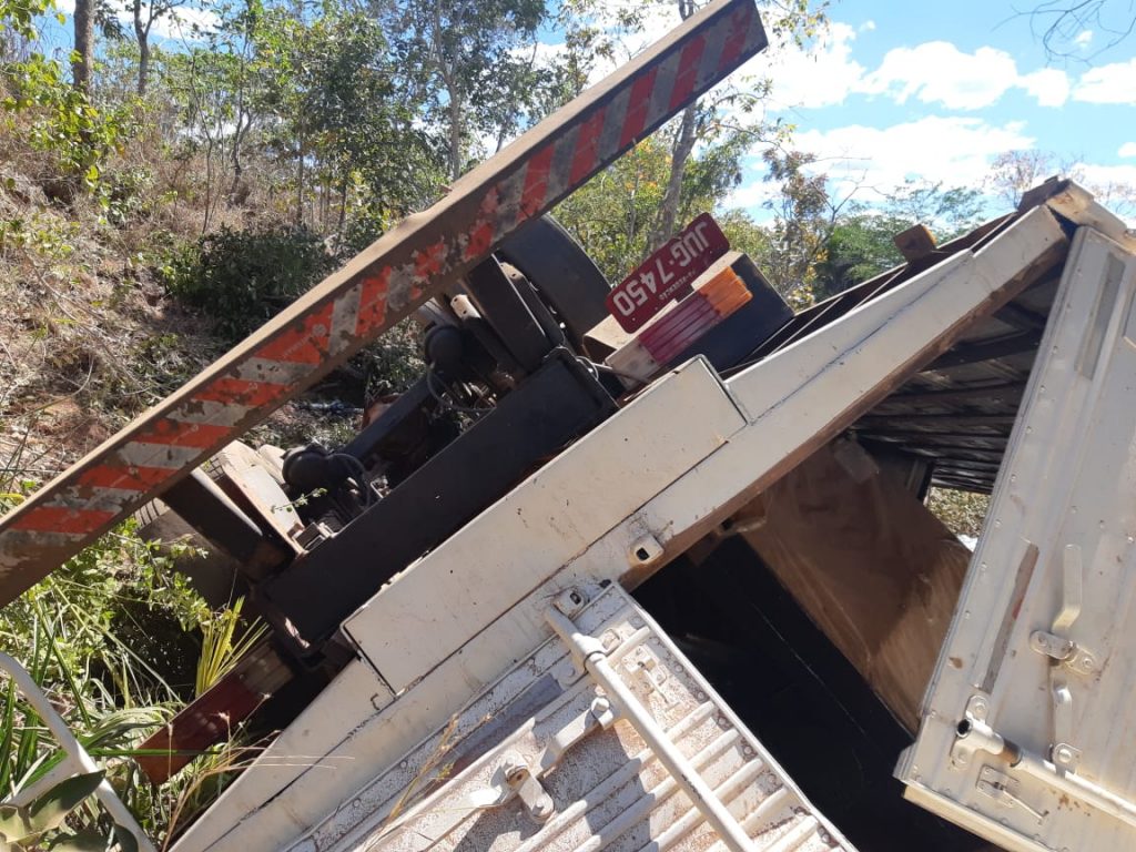 De acordo com o Corpo de Bombeiros o caminhão tombou às margens da rodovia. Três pessoas estavam no veículo e uma chegou a ficar presa nas ferragens.