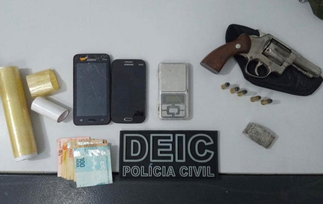 No local foram aprendidos um pedaço de maconha, balança de precisão, munições e um revólver calibre 38.