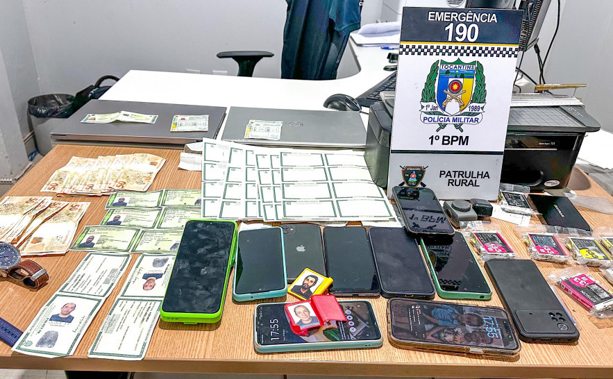 Entre os materiais apreendidos estão: 09 smartphones de diversas marcas (Motorola, Samsung, Xiaomi, Apple), 01 impressora Epson preta, 13 cartuchos de tinta, 01 máquina de passar cartão Stone, 07 cartões de crédito, R$ 1.906,00 (mil novecentos e seis reais) em espécie, além de CNHs e RGs supostamente falsos, 01 carregador de notebook, 01 carimbo cinza, 01 mouse preto, 01 HD externo Mymax, 01 mochila preta, 26 folhas de papel carta, 01 régua pequena e 03 relógios de pulso. Também foi apreendido 01 perfurador usado na confecção das cédulas.