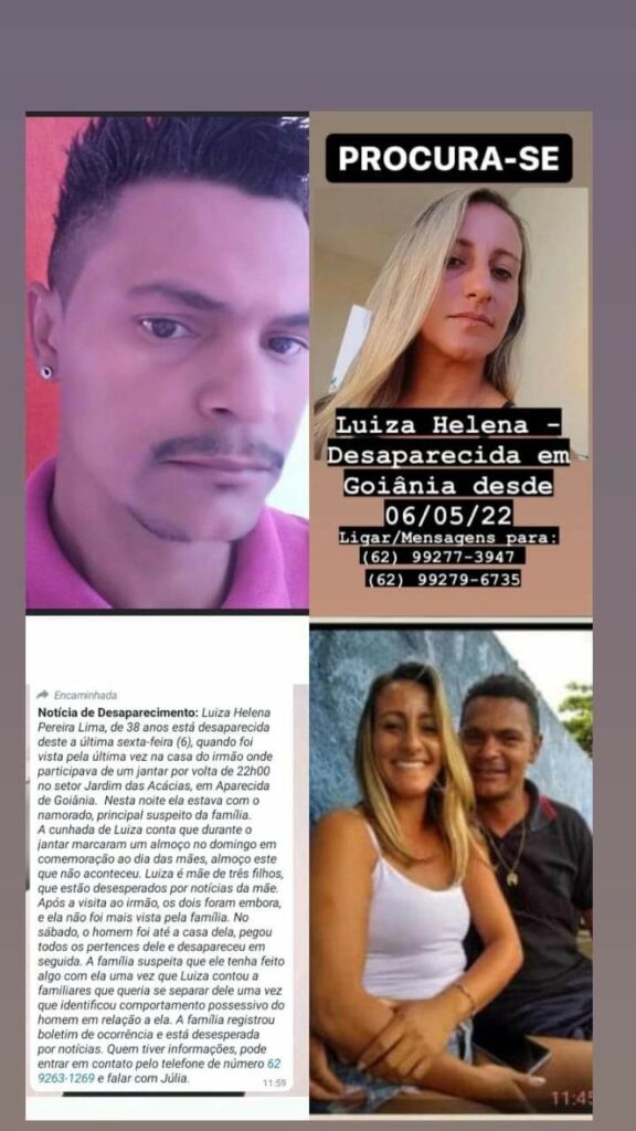 A família conta ainda que a última visualização dela no WhatsApp foi no sábado (7/5) de manhã, mesmo período em que Joaquim esteve na residência em que o casal morava, no Jardim Eldorado, em Aparecida de Goiânia. Ele teria levado pertences de Luiza, dentre eles roupas e documentos pessoais, além de ter tomado R$ 300 emprestados com a irmã dele.