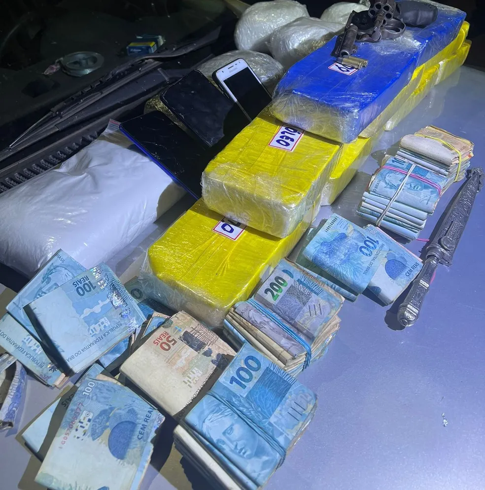 A equipe foi até o local e encontrou a dupla em um Gol prata. Durante as buscas no veículo, foram localizados nove tabletes de substância semelhante a crack, cinco pacotes de substância análoga a cocaína, além de um revólver calibre 32 e munições do mesmo calibre, mais de R$ 50 mil em espécie e quatro aparelhos celulares.