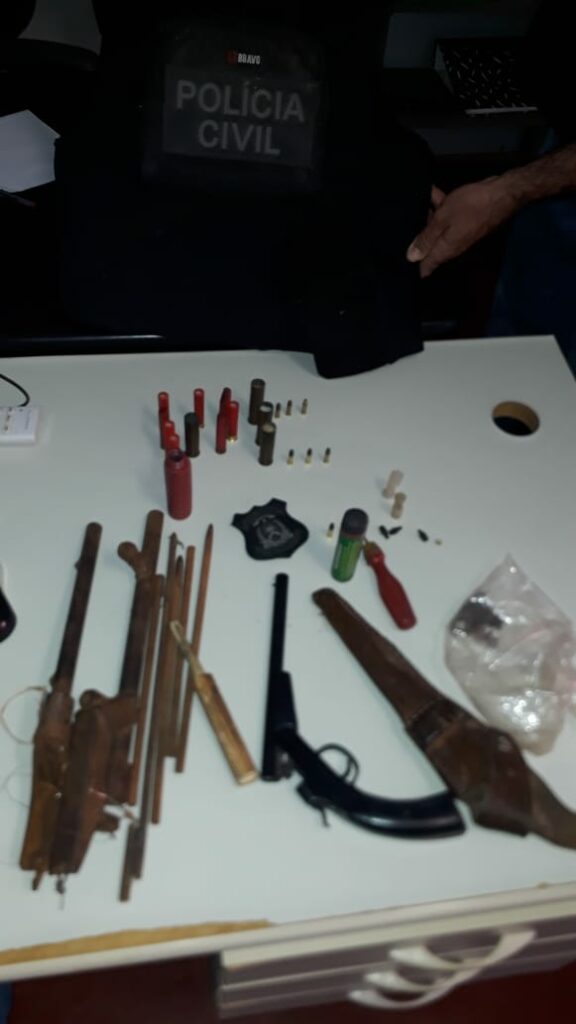 Coordenada pela 96ª Delegacia de Polícia do município, a ação seria em cumprimento de mandado de busca e apreensão, quando o delegado e os agentes flagraram o suspeito de 45 anos portando uma arma de fogo, dois trabucos e diversas munições em sua residência.