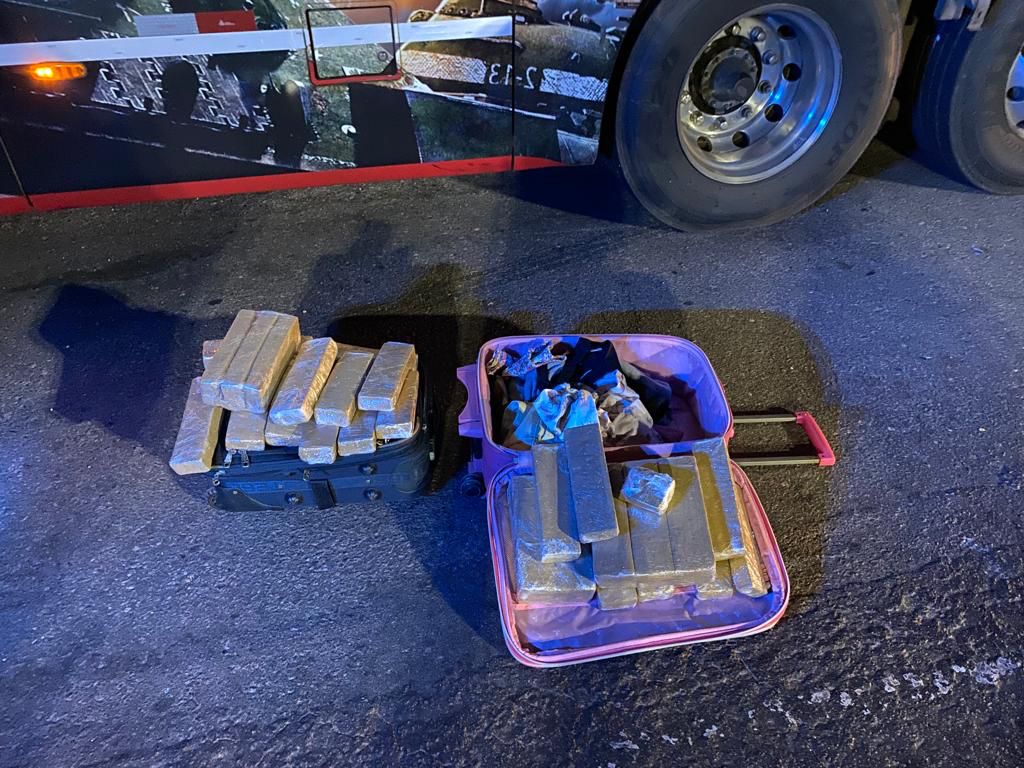 Durante fiscalização, foi abordado um ônibus de transporte rodoviário de passageiros, Scania/Mpolo de cor vermelha. Ao realizar inspeção, os agentes da Polícia Rodoviária Federal localizaram, em duas bagagens, 42 tabletes contendo substância análoga à maconha, em um total de 25,4kg.