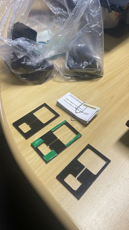 Em seguida, os suspeitos afixavam esses cartazes falsos no ambiente de autoatendimento bancário e instalavam petrechos nos caixas eletrônicos, de modo que os cartões magnéticos dos clientes ficavam retidos no equipamento.