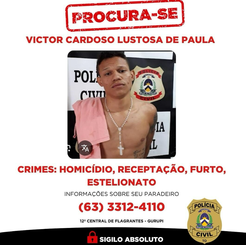 A Polícia Civil do Tocantins está realizando buscas por Victor Cardoso Lustosa de Paula, que fugiu na noite deste domingo (26) durante uma transferência entre uma unidade prisional e o Hospital Municipal de Cariri do Tocantins, no sul do estado.