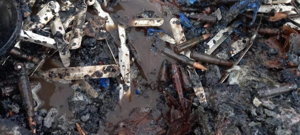 Com o controle das chamas, foi possível fazer uma vistoria no veículo e nesse momento a equipe da PRF encontrou diversas munições que estavam localizadas entre os escombros do caminhão. Ao todo, 125 munições de 2 calibres foram encontradas: 87 munições calibre .308 e 38 munições calibre .38.