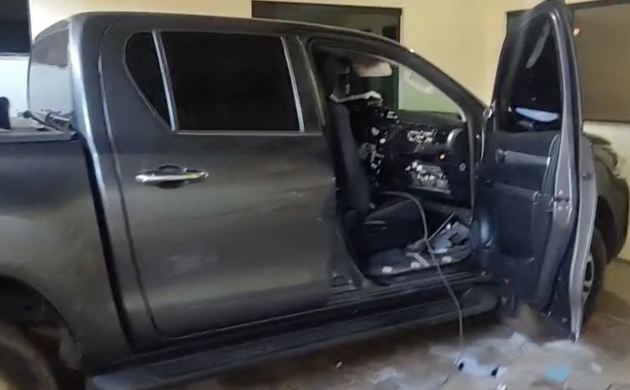 A caminhonete estava em uma casa usada como cativeiro pelos criminosos. O veículo já estava parcialmente desmontado quando a polícia chegou ao local. No imóvel foram encontrados aparelhos como bloqueadores de sinal de GPS, aparelhos para codificação de chaves e ignição de veículos, além dos conjuntos de placas das outras duas caminhonetes furtadas e um outro veículo também alvo de furto.
