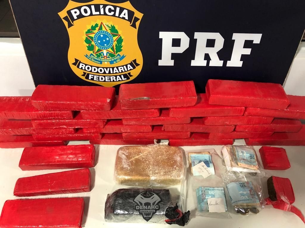 No interior do automóvel, no baco traseiro, guardadas em bolsas e sacolas, foram encontradas 26 barras inteiras e 3 pedaços de substância análoga à maconha e uma barra de produto análogo ao Crack. Além do entorpecente, ainda foram apreendidos R$ ‭2.683,75‬ em espécie, referido dinheiro estava com as mulheres passageiras.
