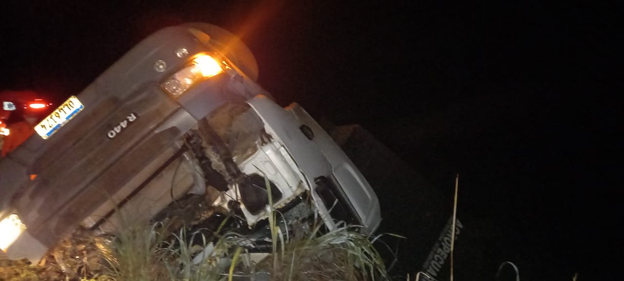 Segundo o Corpo de Bombeiros, uma carreta carregada com bois tombou fora da pista, e no interior da cabine havia uma pessoa presa as ferragens já em óbito.