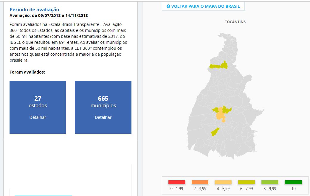 De acordo com o último levantamento divulgado pela Escala Brasil Transparente – Avaliação 360º, do Ministério da Controladoria-Geral da União, que avaliou 691 entes federativos com mais de 50 mil habitantes (com base nas estimativas de 2017 do IBGE – Instituto Brasileiro de Geografia e Estatística) – universo que abrange quase 70% da população brasileira, a partir de informações coletadas entre os dias 9 de julho e 14 de novembro de 2018, os portais das administrações municipais tiveram, em média, nota 6,50.