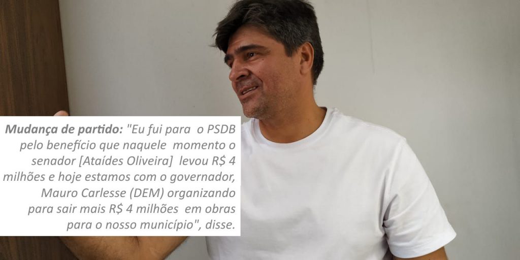 “O intuito não só meu; mas de N´s prefeitos por aí é buscar os benefícios para a cidade. Então, eu fui para o PSDB pelo benefício que naquele momento o senador [Ataídes Oliveira] levou R$ 4 milhões e hoje estamos com o governador, Mauro Carlesse (DEM) organizando para sair mais R$ 4 milhões em obras para o nosso município. Então, onde for melhor para nossa sociedade e para nossos eleitores nós vamos está buscando e vamos está ali em benefícios deles”, disse.