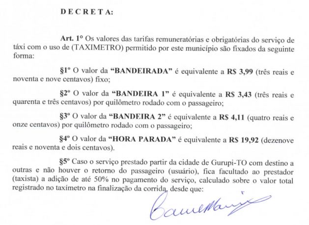 Por meio do Decreto Nº 1.295, ficaram estipulados os valores das tarifas do serviço de táxi com uso do taxímetro. A “Bandeirada”, que é a chamada do serviço de táxi será R$ 3,99. A “Bandeira 1”, que é o serviço no período de segunda-feira a sábado das 06h as 20h será R$ 3,43 por quilômetro rodado com o passageiro. A “Bandeira 2”, que é o serviço no período de segunda-feira a sábado das 20h às 06h, aos domingos e feriados, será de R$ 4,11 por quilômetro rodado com o passageiro. Já a “Hora Parada”, que é o período em que o táxi permanece parado a serviço do passageiro será R$ 19,92.