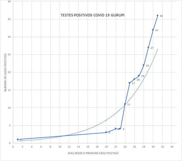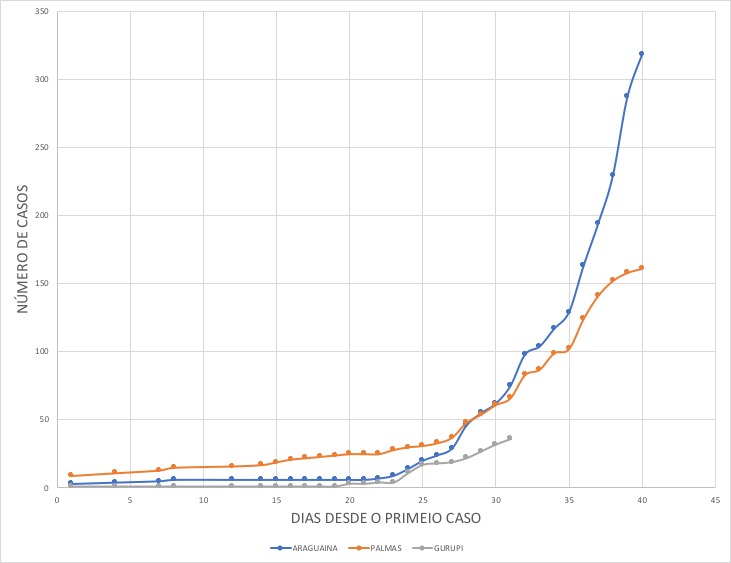 O gráfico mostra o crescimento exponencial e curva epidêmica de Covid-19 em Gurupi, Palmas e Araguaína.