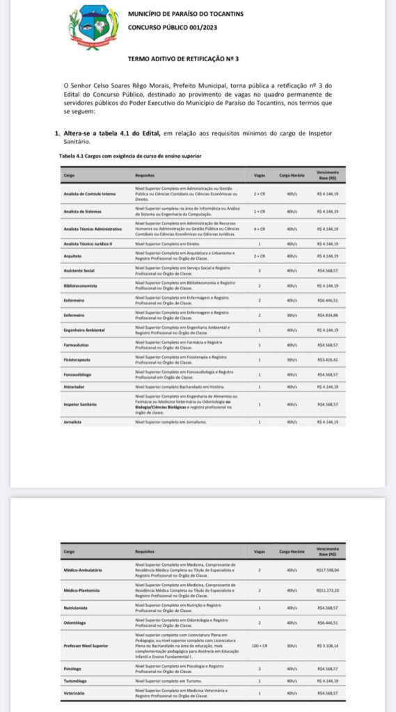 A Prefeitura de Paraíso do Tocantins, por meio da Secretaria de Administração e Finanças, divulgou nesta segunda-feira, 17, o termo aditivo de retificação 03, do edital do concurso público para provimento de vagas do quadro permanente de servidores do município.