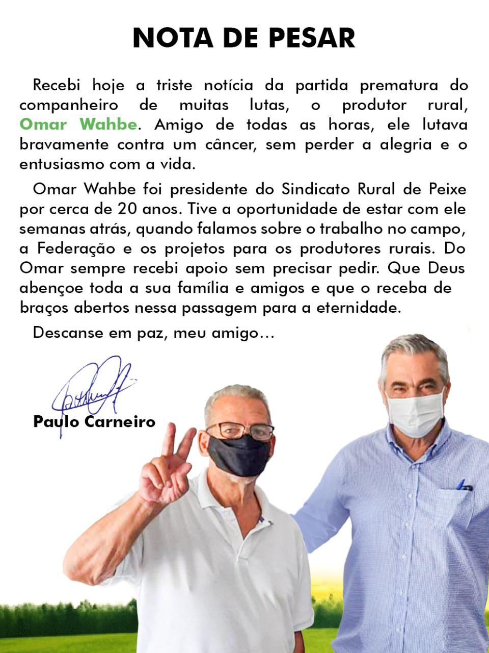 O Presidente da Federação da Agricultura e Pecuária do Estado do Tocantins (FAET) e do Serviço Nacional de Aprendizagem Rural do Tocantins (SENAR-TO), Paulo Carneiro, e o presidente do Sindicato Rural de Peixe, Pedro Luiz Pinto Prevedello, lamentaram a morte de Omar Wahbe, 71 anos.
