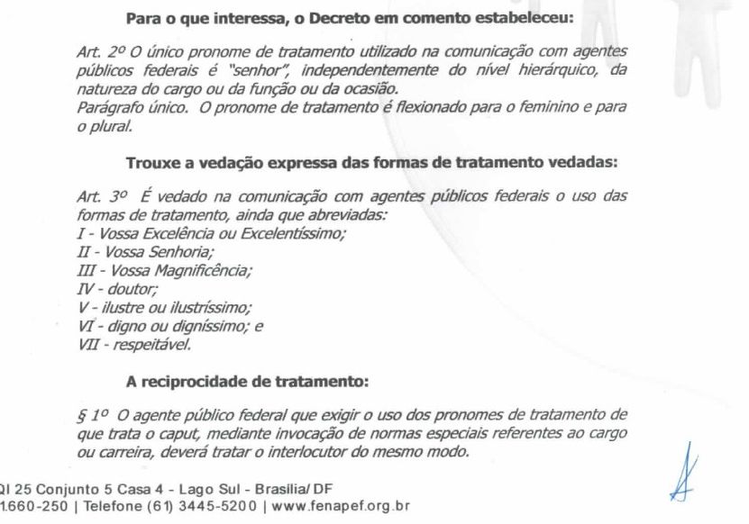 No oficio, o presidente da FENAPEF, Luís Antônio de Araújo Boudens, requereu que o Diretor Geral da Polícia Federal determine a imediata correção em todos os sistemas internos de comunicação e redação da Polícia Federal e que editada mensagem circular orientando todo quadro de pessoal sobre as modificações constadas no Decreto, bem como oriente em relação à inadequada utilização de título acadêmico “doutor” como pronome de tratamento, inclusive em cerimonial da Polícia Federal.