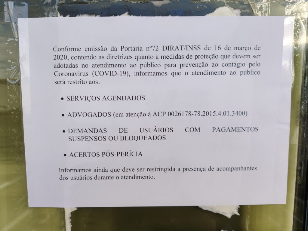 A reportagem do portal Atitude esteve no INSS de Gurupi na tarde desta terça-feira e deparou com o órgão fechado com um cartaz na porta informando a Portaria número 72 com as diretrizes quanto às medidas de proteção que devem ser adotadas no atendimento público para prevenção do contágio pelo Coronavírus (COVID-19). Nela consta que os atendimentos serão restritos aos serviços agendados, advogados (em atenção a ACP 0026178-78.2015.4.01.3.400) e acertos pós-perícia.