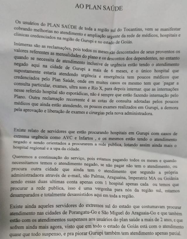 Representantes de servidores público estaduais que participam do Plansaúde foram para frente do É pra Já, onde há posto de atendimento da Infoway, empresa contratada para administrar o Plansaúde, para entregar um documento que aponta reclamações sobre os serviços e várias reivindicações, dentre elas ampliação de hospitais aptos a receberem urgência e emergência em Gurupi e no Estado de Goiás, cadastro de médicos especialistas nas áreas de cardiologia, neurologia, otorrino, pediatria, reumatologia, ginecologia e obstetrícia, dermatologia, endocrinologia, psiquiatria, urologia, gastro, odontologia e clínicos, dentre outras.