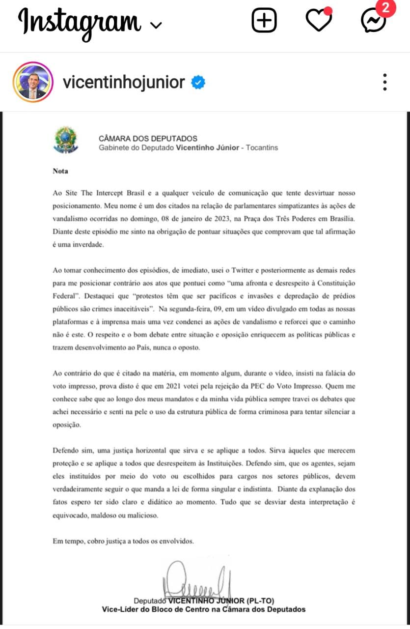 Em nota o deputado Vicentinho Júnior rebateu o conteúdo da reportagem: