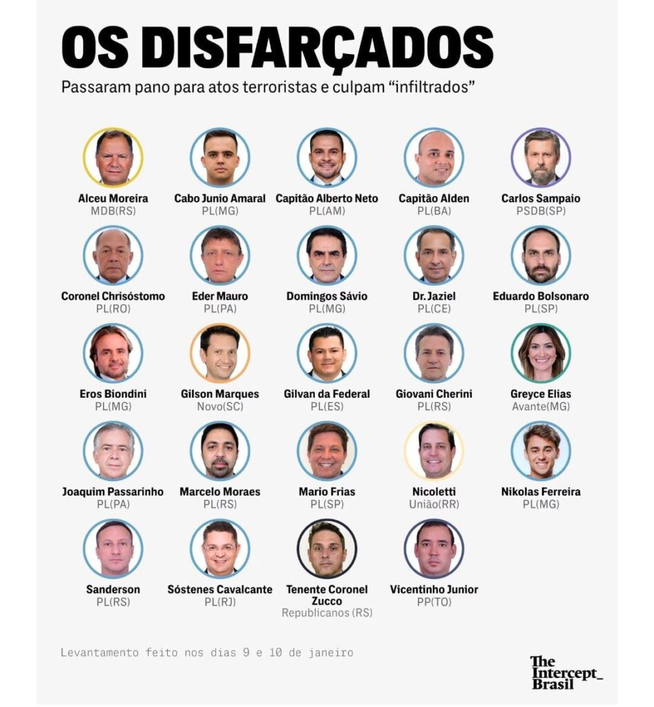 “Dos 24 simpatizantes disfarçados, 17 são do PL, partido que falhou em reeleger Bolsonaro em outubro. Um desses parlamentares é o mineiro Nikolas Ferreira, deputado mais votado do Brasil. Os demais são do PSDB, Novo, MDB, União Brasil, PP, Avante e Republicanos. Entre eles, estão os que culparam o Supremo Tribunal Federal, Alexandre de Moraes ou o próprio Congresso pelos atos violentos. Um exemplo é o deputado federal Vicentinho Júnior, do PP de Tocantins. Ele gravou um vídeo colocando em dúvida a já comprovada segurança das urnas eletrônicas e insistindo na falácia do voto impresso.”