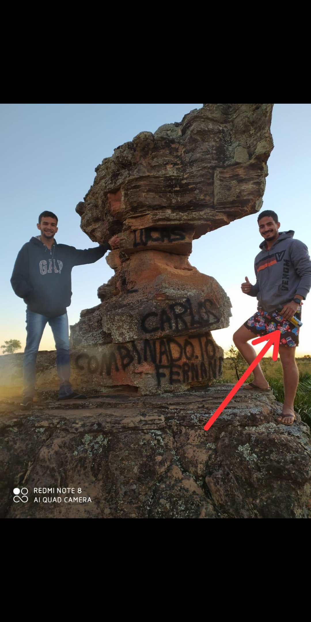 Os suspeitos de vandalismo chegaram a postar fotos nas redes sociais, logo após a ação. Um dos autores inclusive segura uma lata de spray, enquanto outro aponta para o nome que foi pichado na pedra.