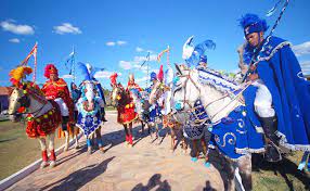 Ao todo, são 24 cavaleiros, sendo 12 cristãos, vestidos de azul, com a missão de converter os inimigos ao cristianismo, e 12 mouros (mulçumanos), trajados de vermelho e defensores da própria fé. É uma referência às Cruzadas, sendo que no final os cristãos sempre vencem os mouros.
